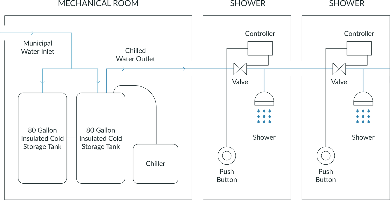 The shower controller(s) require a pushbutton to be installed in the tile at the point of use inside the shower stall, a solenoid valve to be installed in line with the shower head used to discharge the chilled water, and a shower controller to be installed near each shower (typically in the drop ceiling).